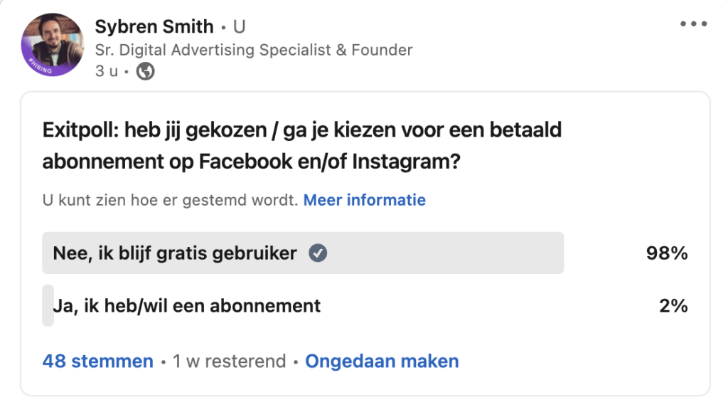 Ik vroeg in een Poll op LinkedIn wat mensen zouden kiezen / of al gekozen hebben. Hoewel mijn volgers geen doorsnede zullen zijn van de Europese bevolking valt wel direct op dat slechts een enkeling wilt betalen voor zijn privacy en/of een advertentievrije ervaring.